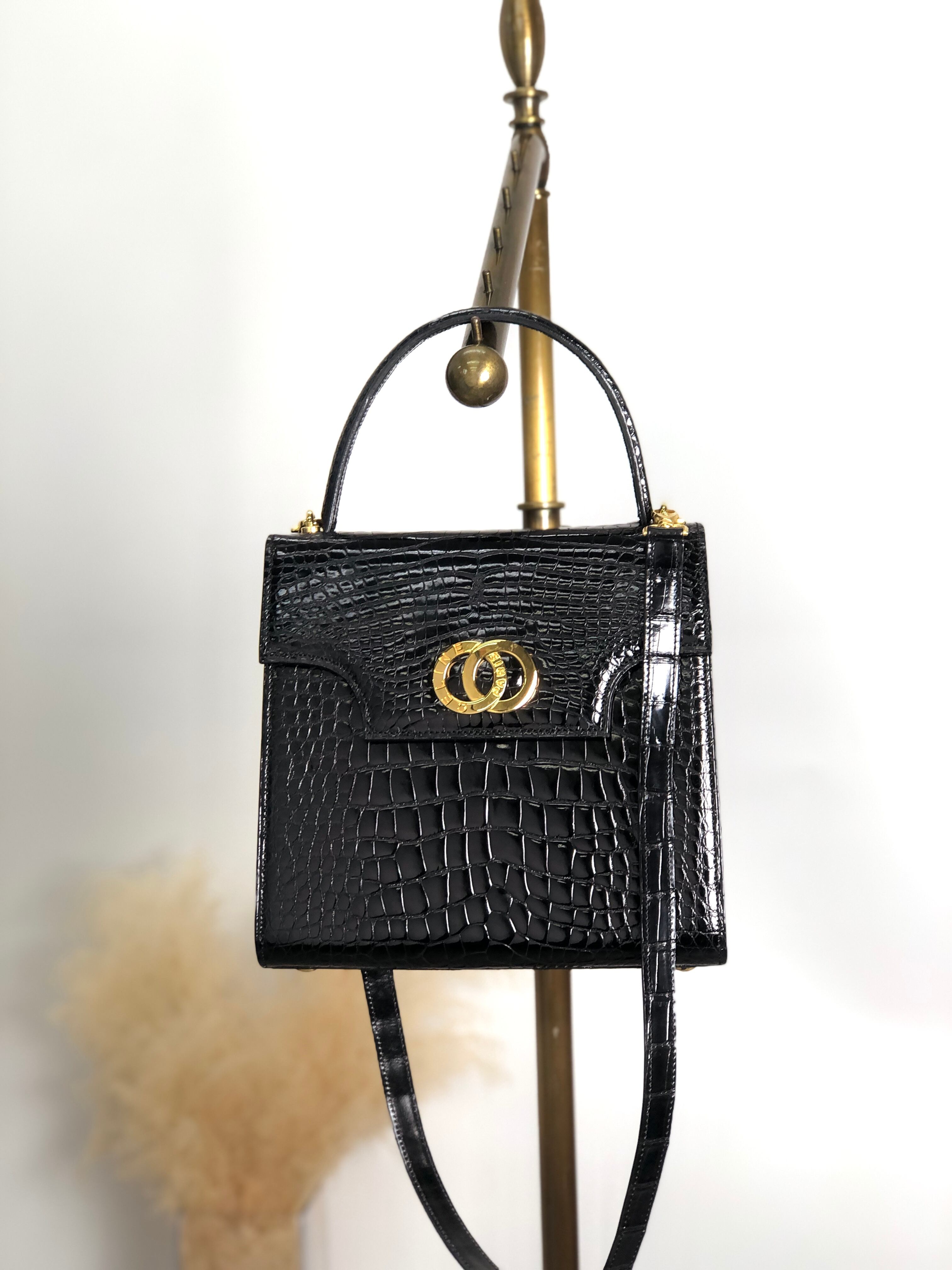 CELINE セリーヌ ショルダーバッグ ブラック ダブルサークルロゴ クロコ型押し 2way トップハンドル vintage ヴィンテージ オールド bwjy43