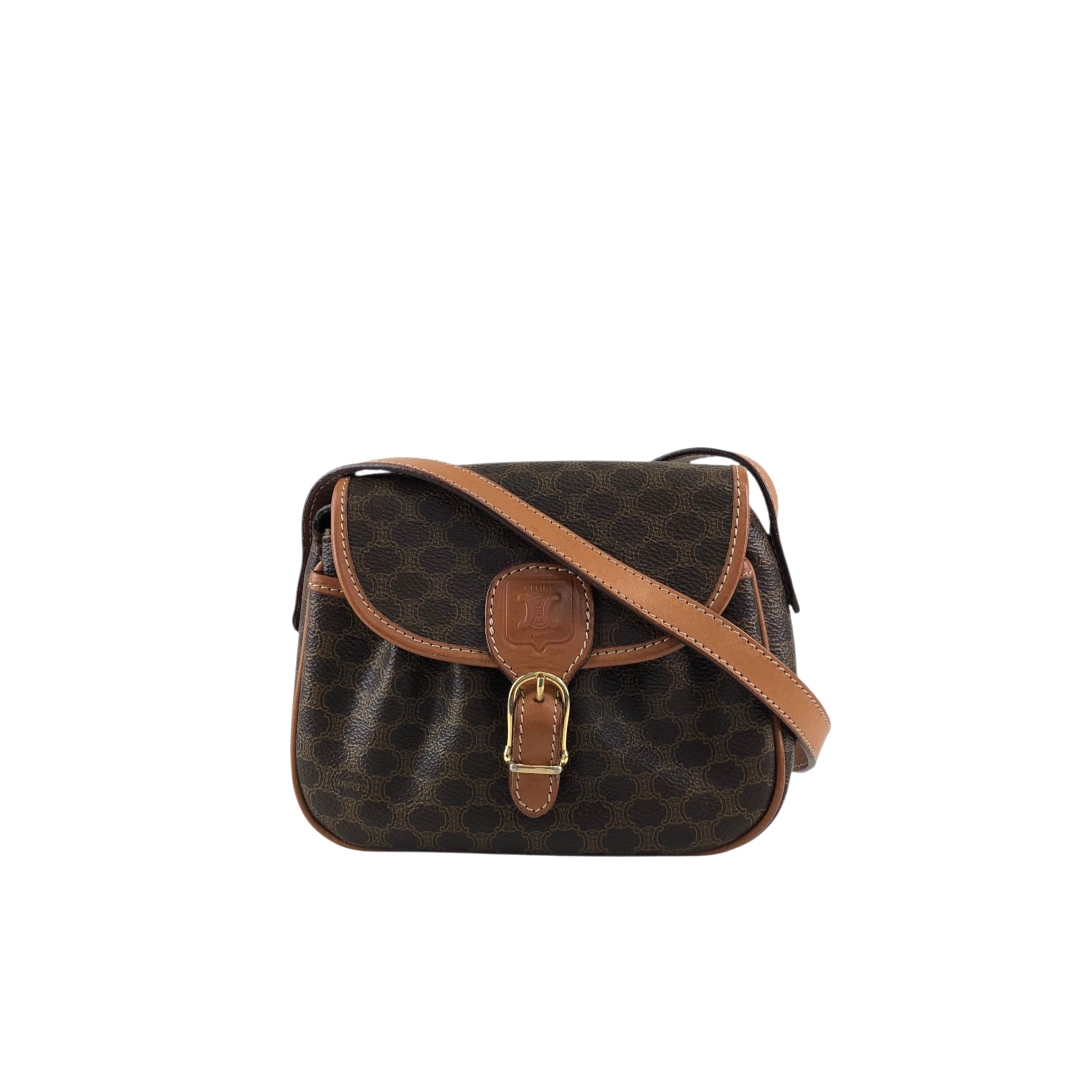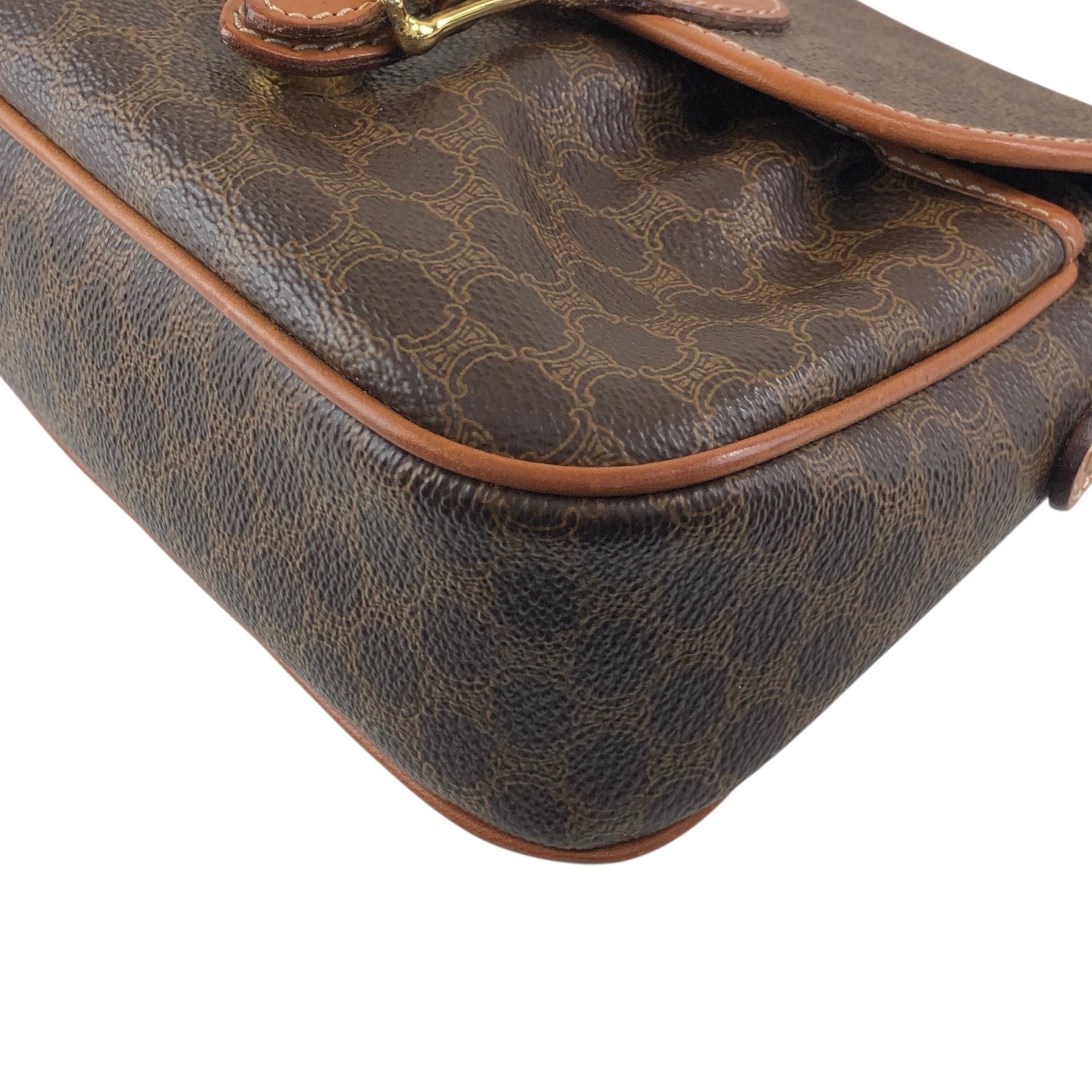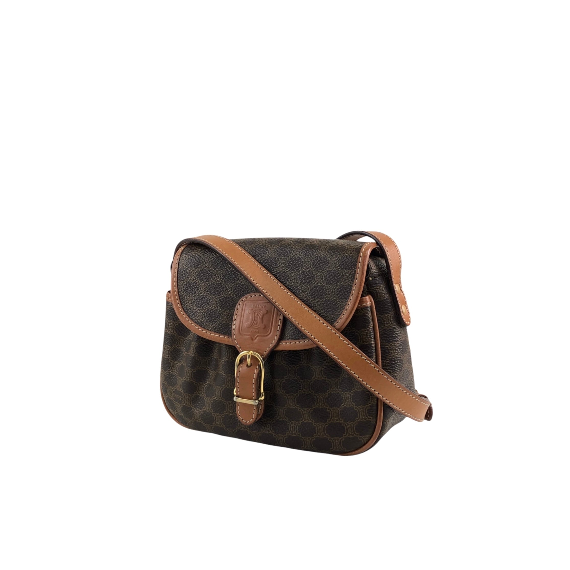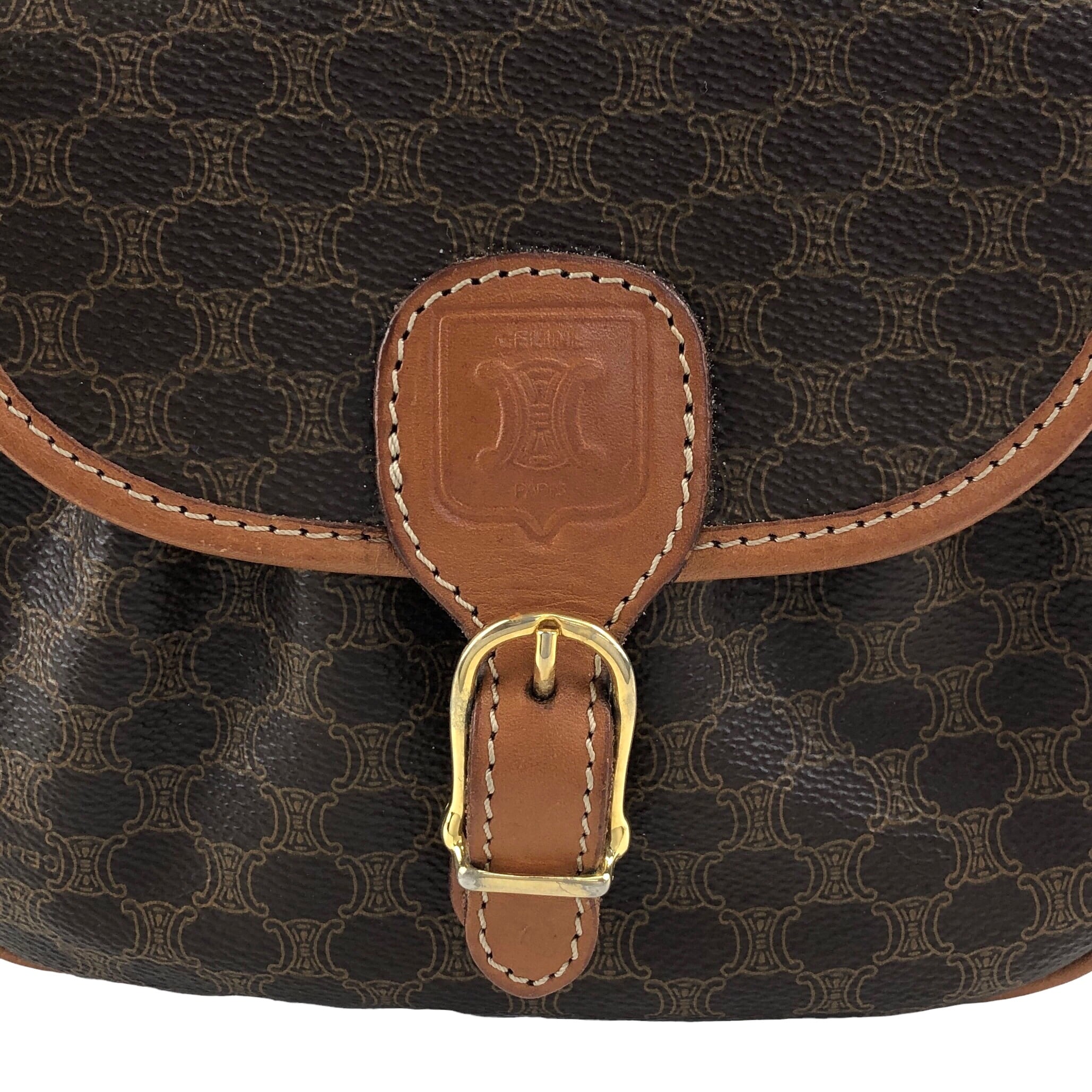 CELINE セリーヌ マカダム ショルダーバッグ ブラウン ブラゾン型押し フロントバックル PVC レザー ミニバッグ vintage ヴィンテージ オールド zzu5ya