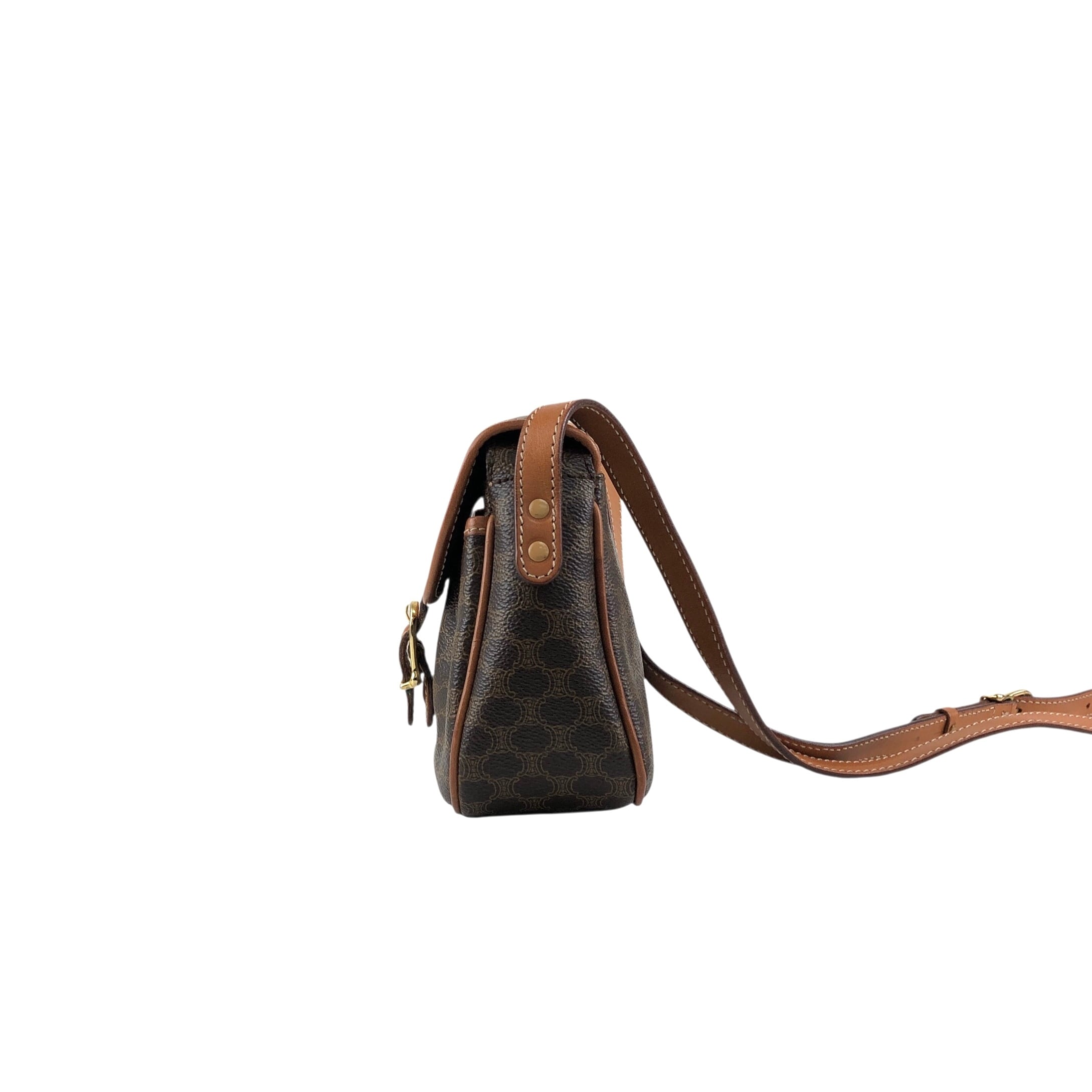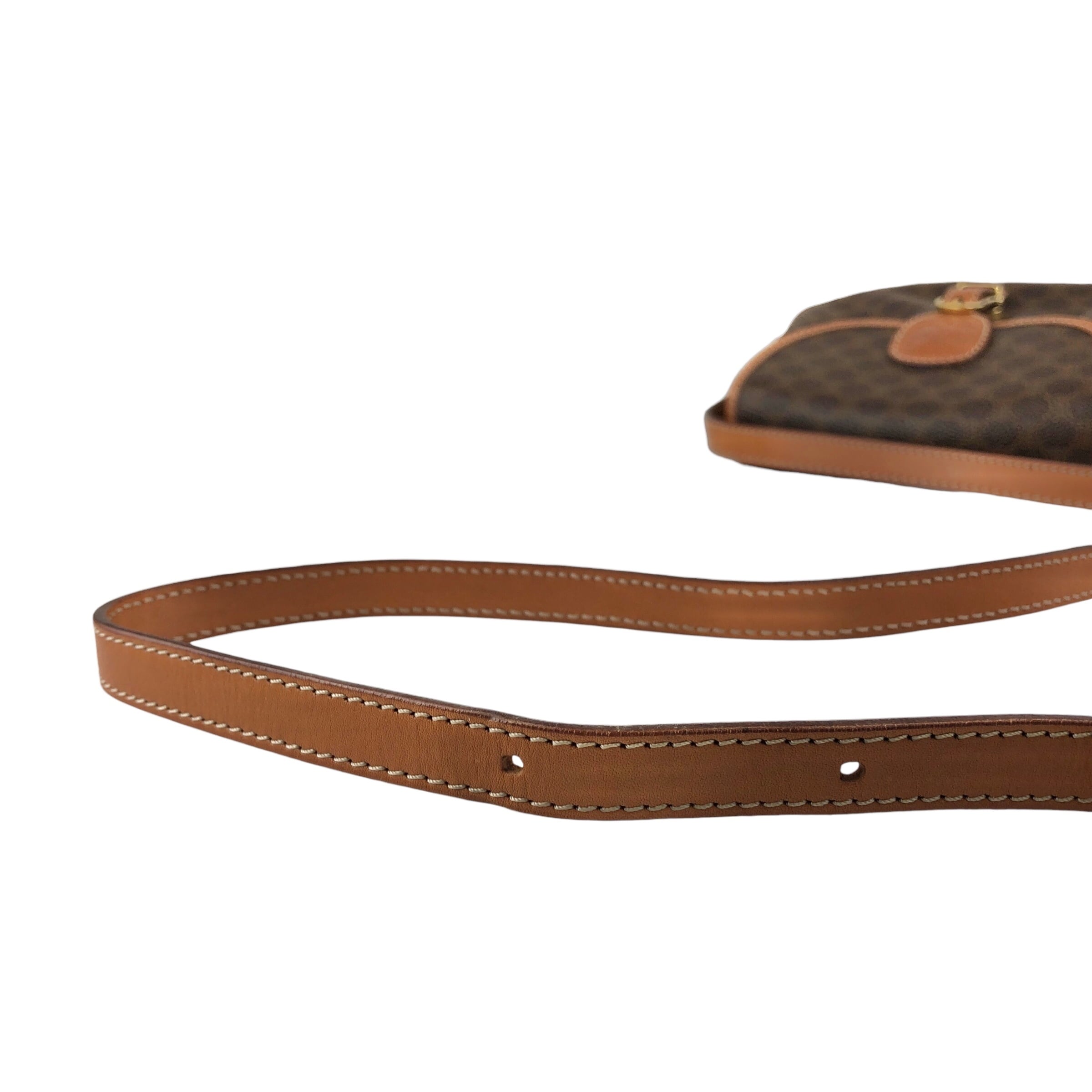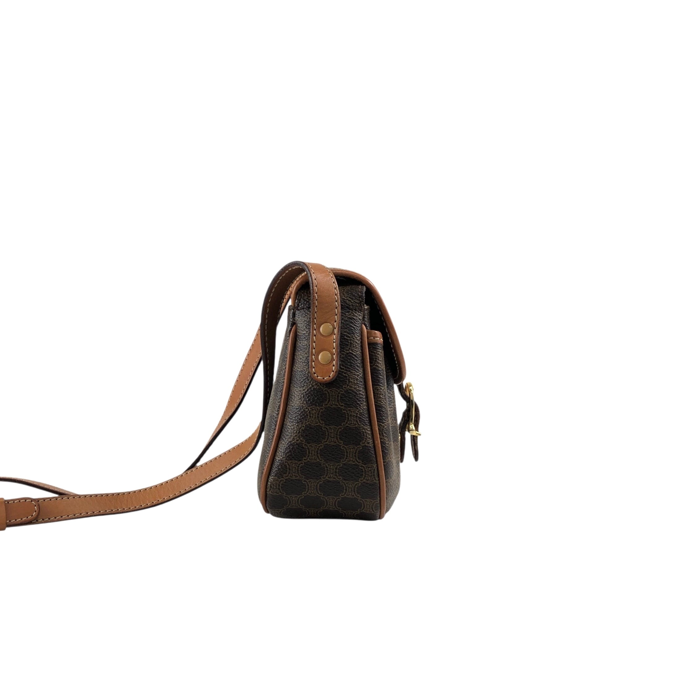 CELINE セリーヌ マカダム ショルダーバッグ ブラウン ブラゾン型押し フロントバックル PVC レザー ミニバッグ vintage ヴィンテージ オールド zzu5ya