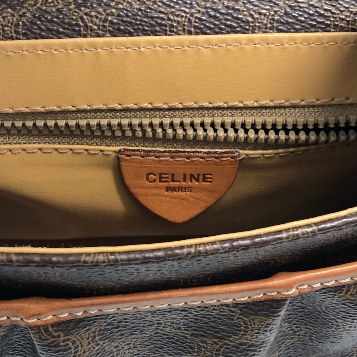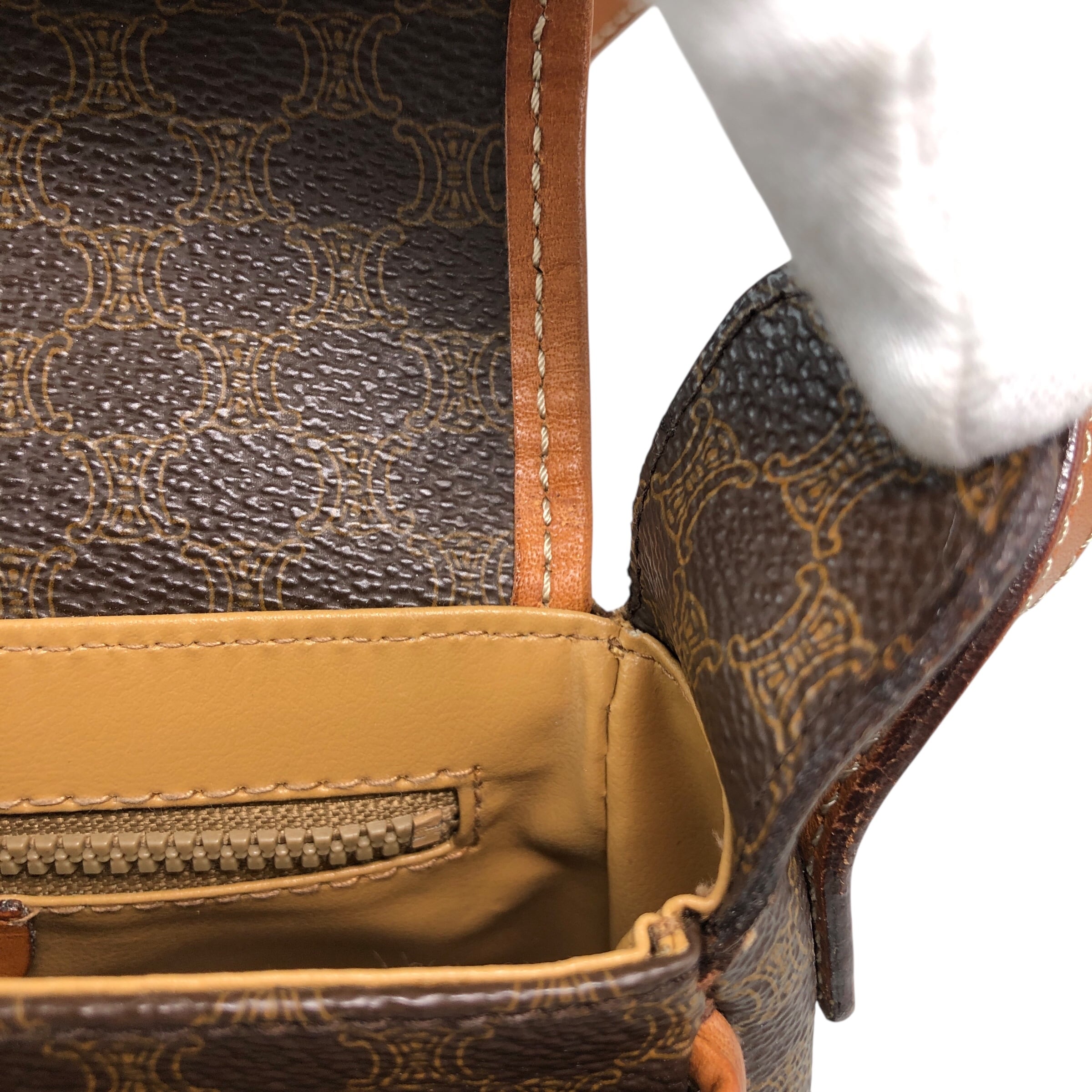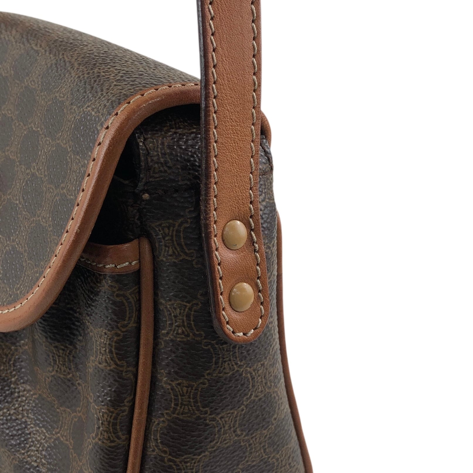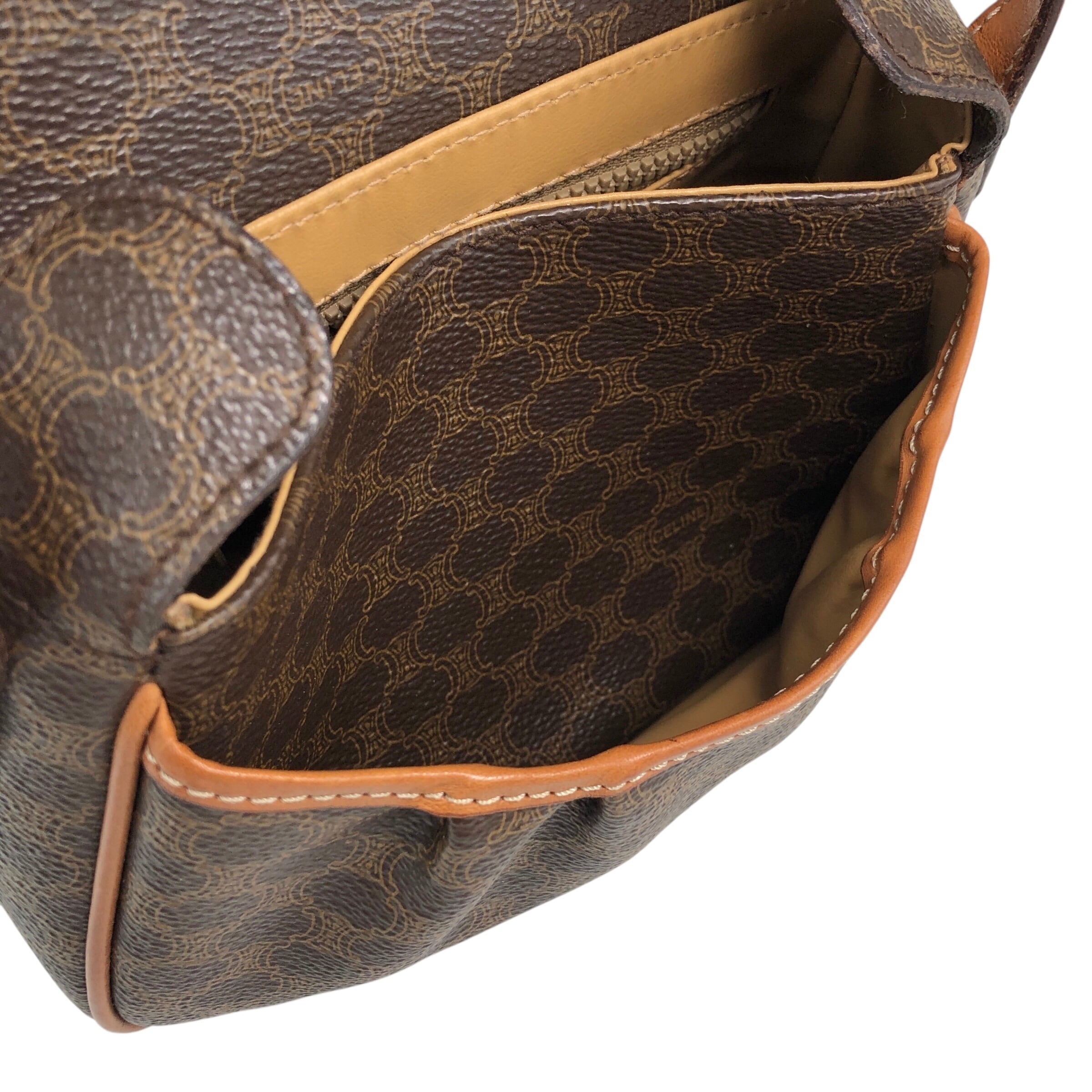 CELINE セリーヌ マカダム ショルダーバッグ ブラウン ブラゾン型押し フロントバックル PVC レザー ミニバッグ vintage ヴィンテージ オールド zzu5ya