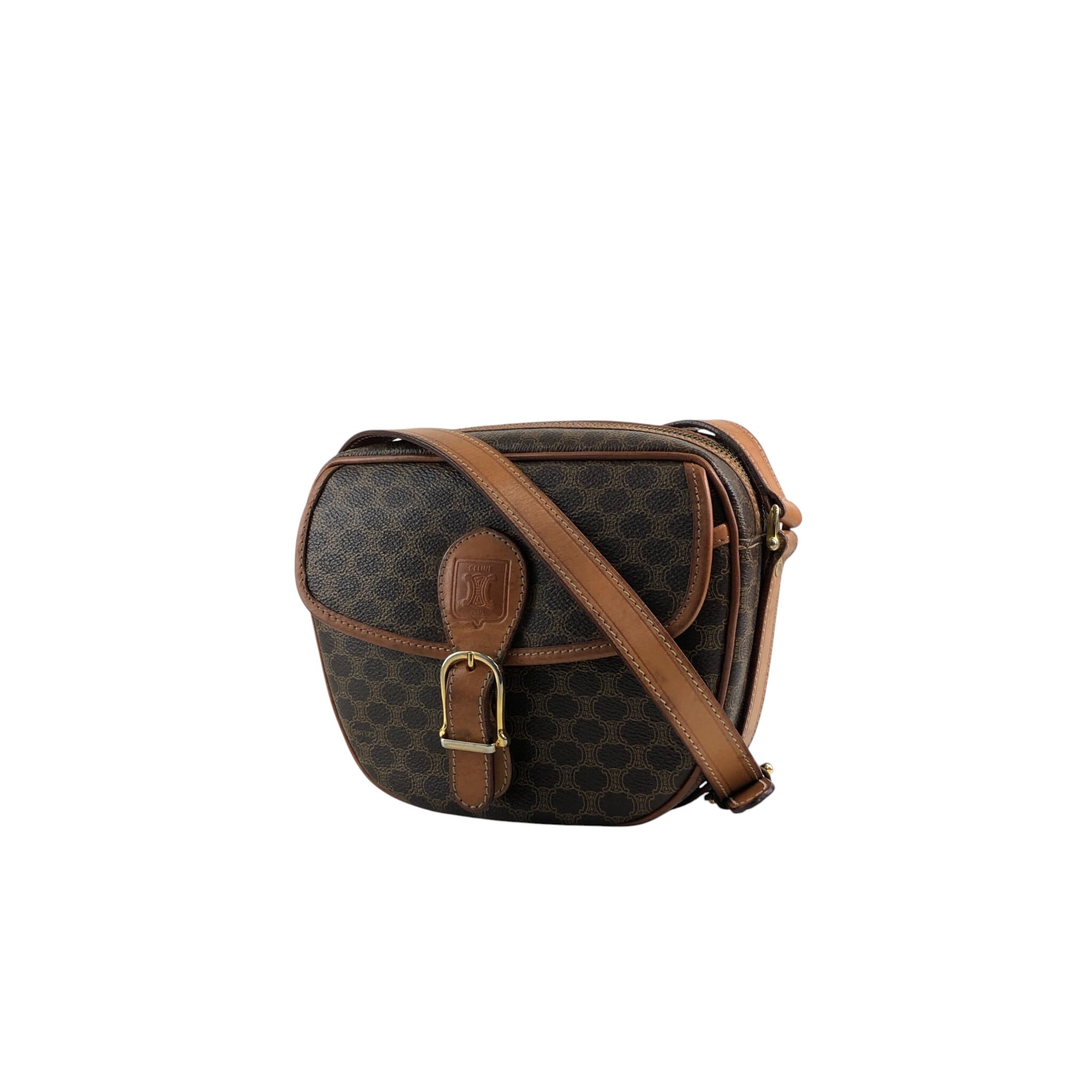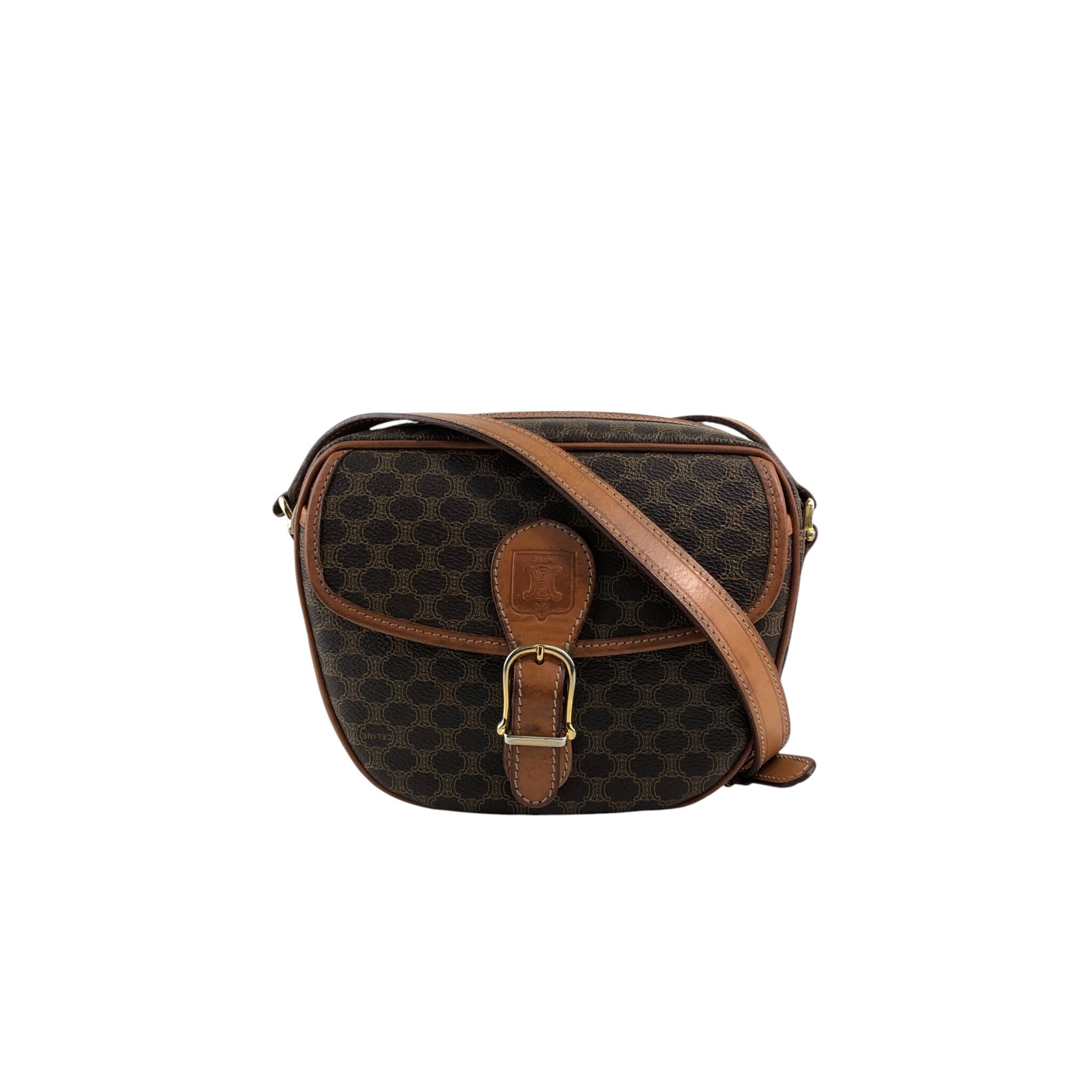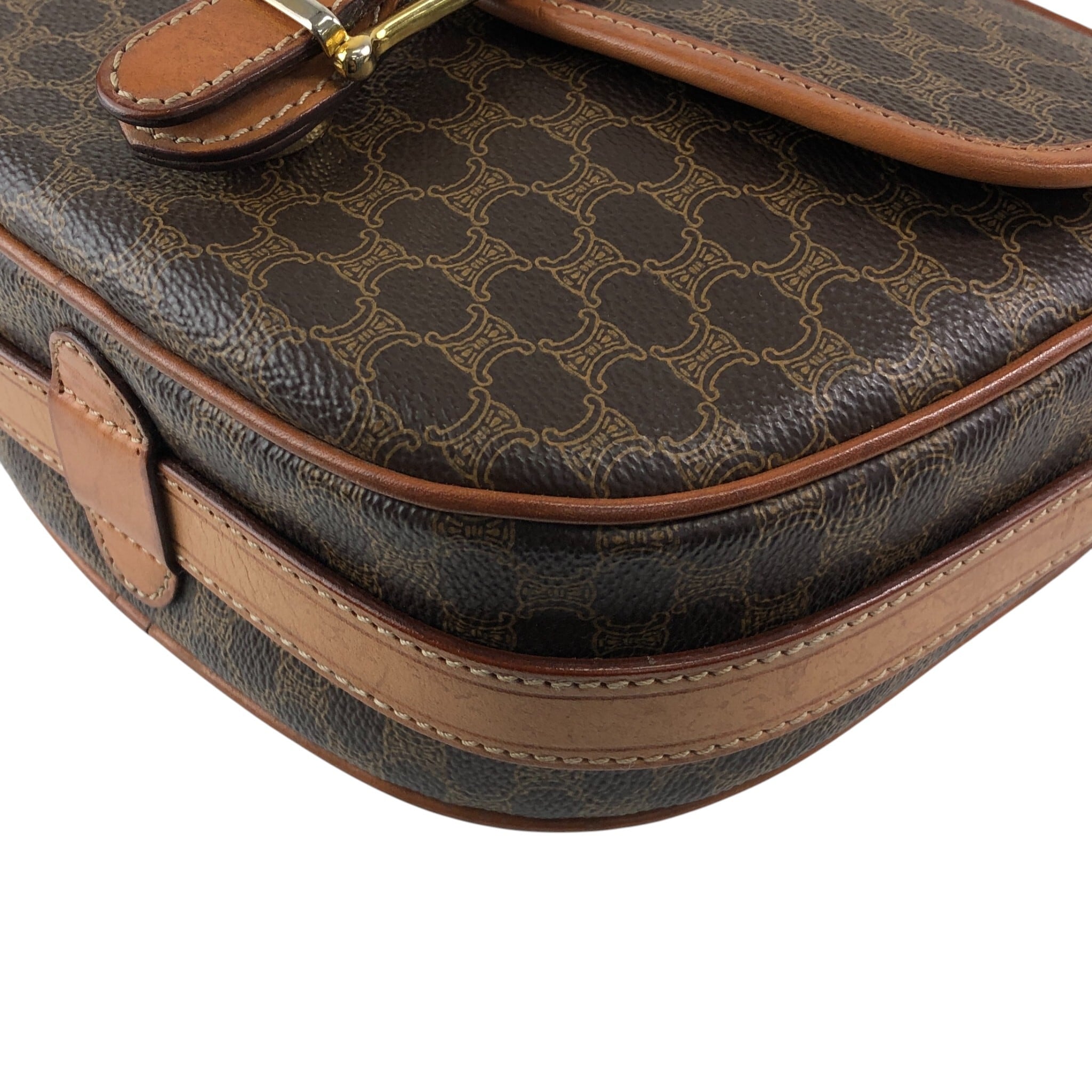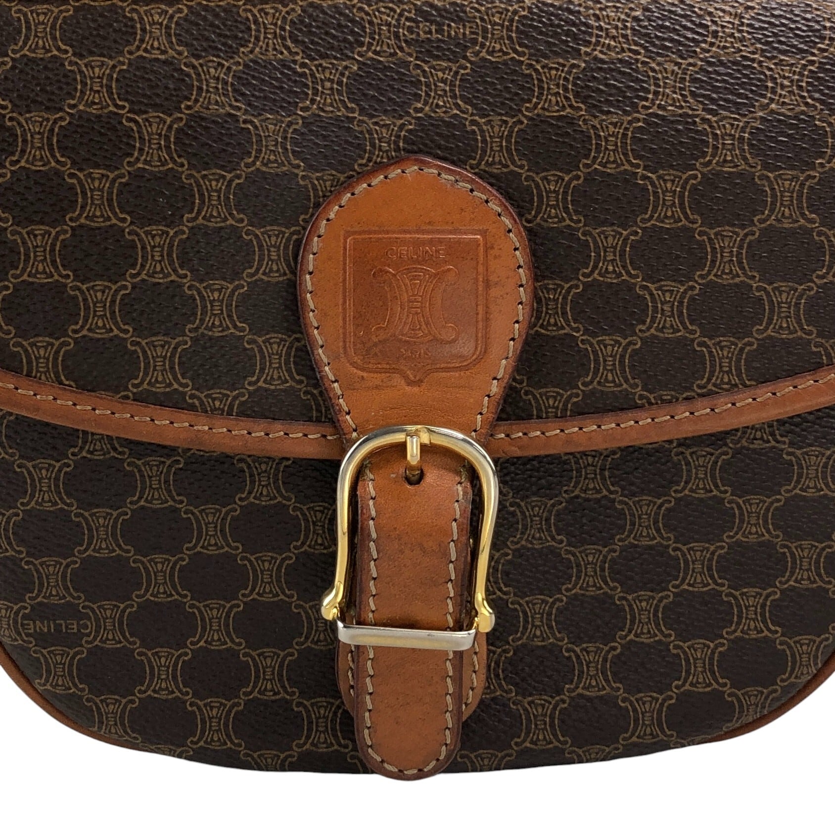 CELINE セリーヌ マカダム ショルダーバッグ ブラウン ブラゾン型押し フロントバックル PVC レザー vintage ヴィンテージ オールド 8awzkp