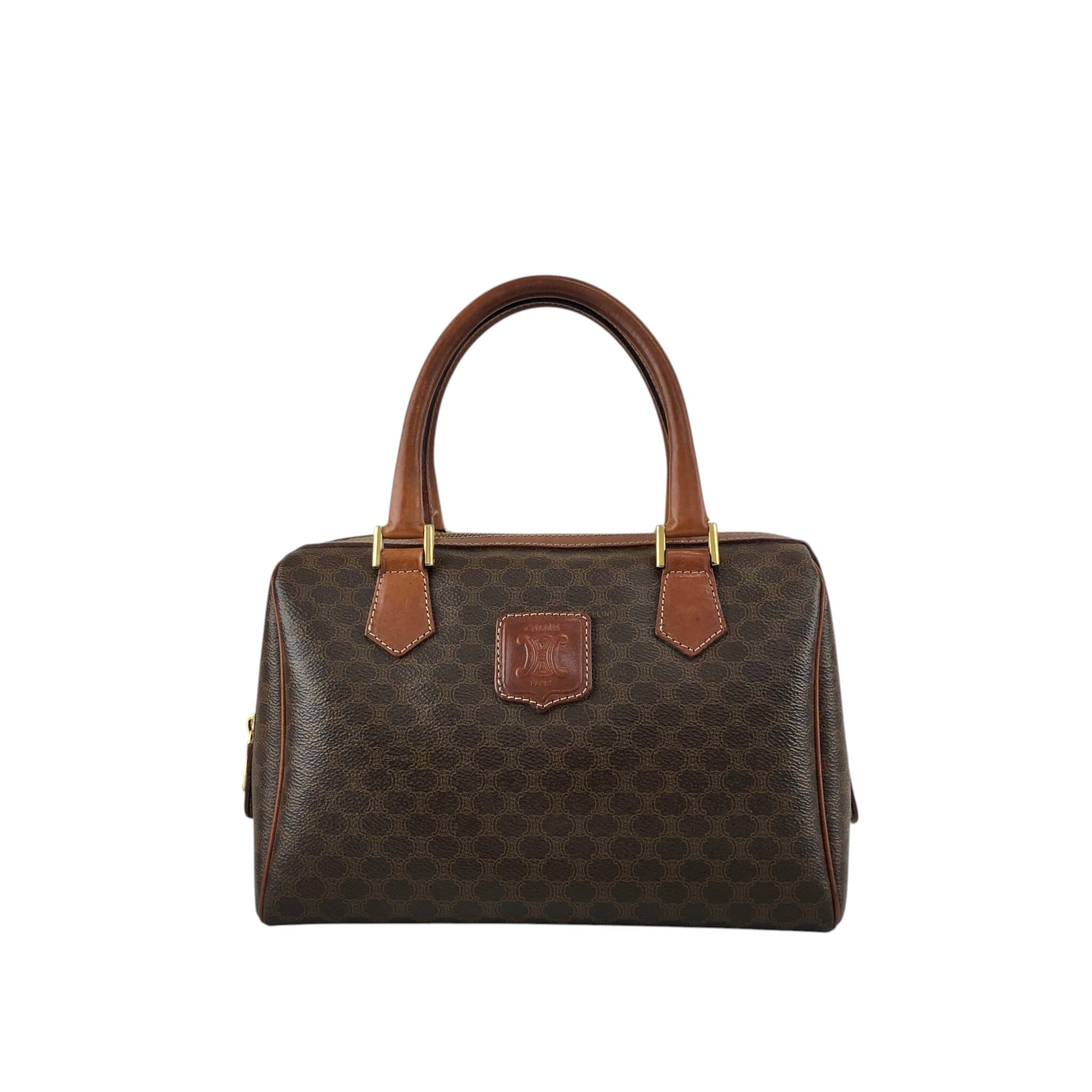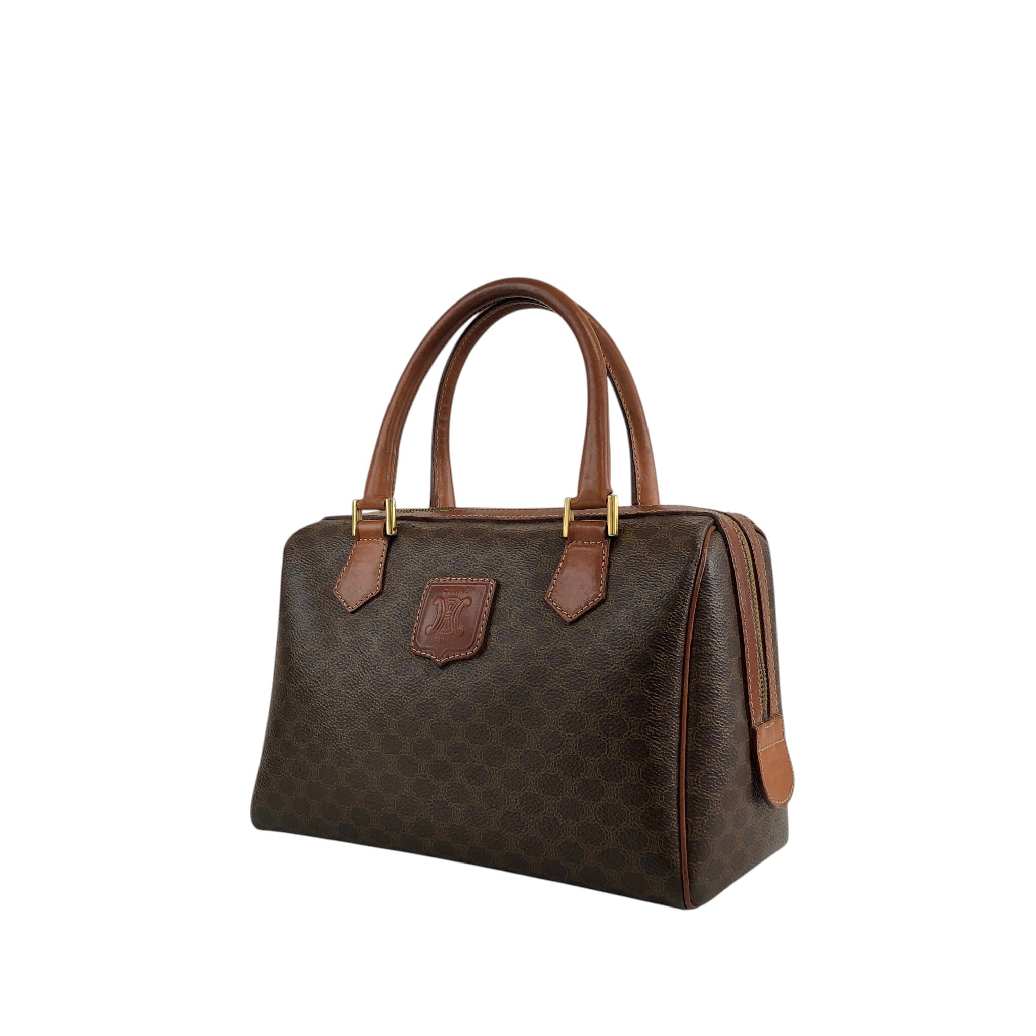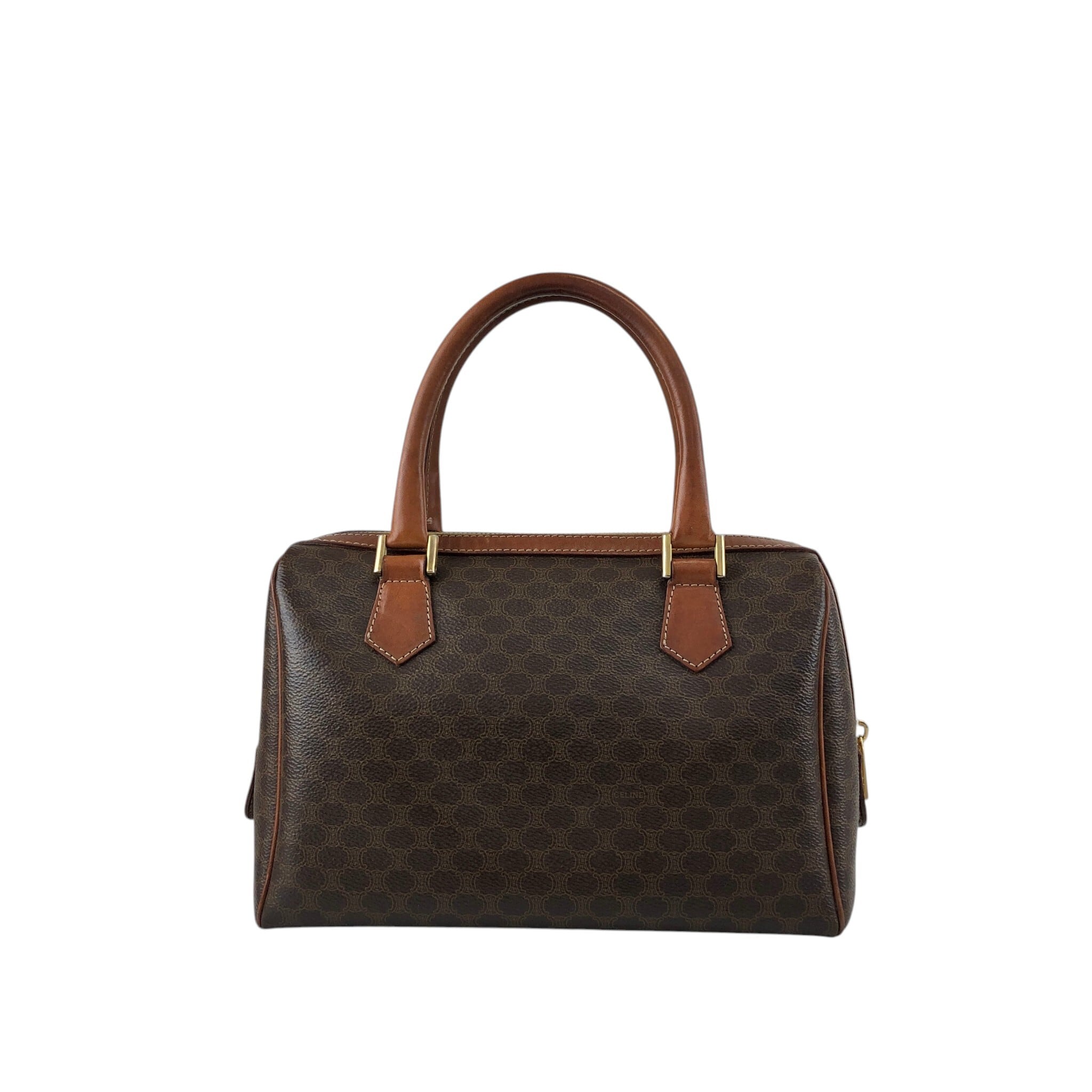 CELINE セリーヌ マカダム ハンドバッグ ブラウン ブラゾン型押し PVCレザー ミニボストン vintage ヴィンテージ オールド f2ydjv